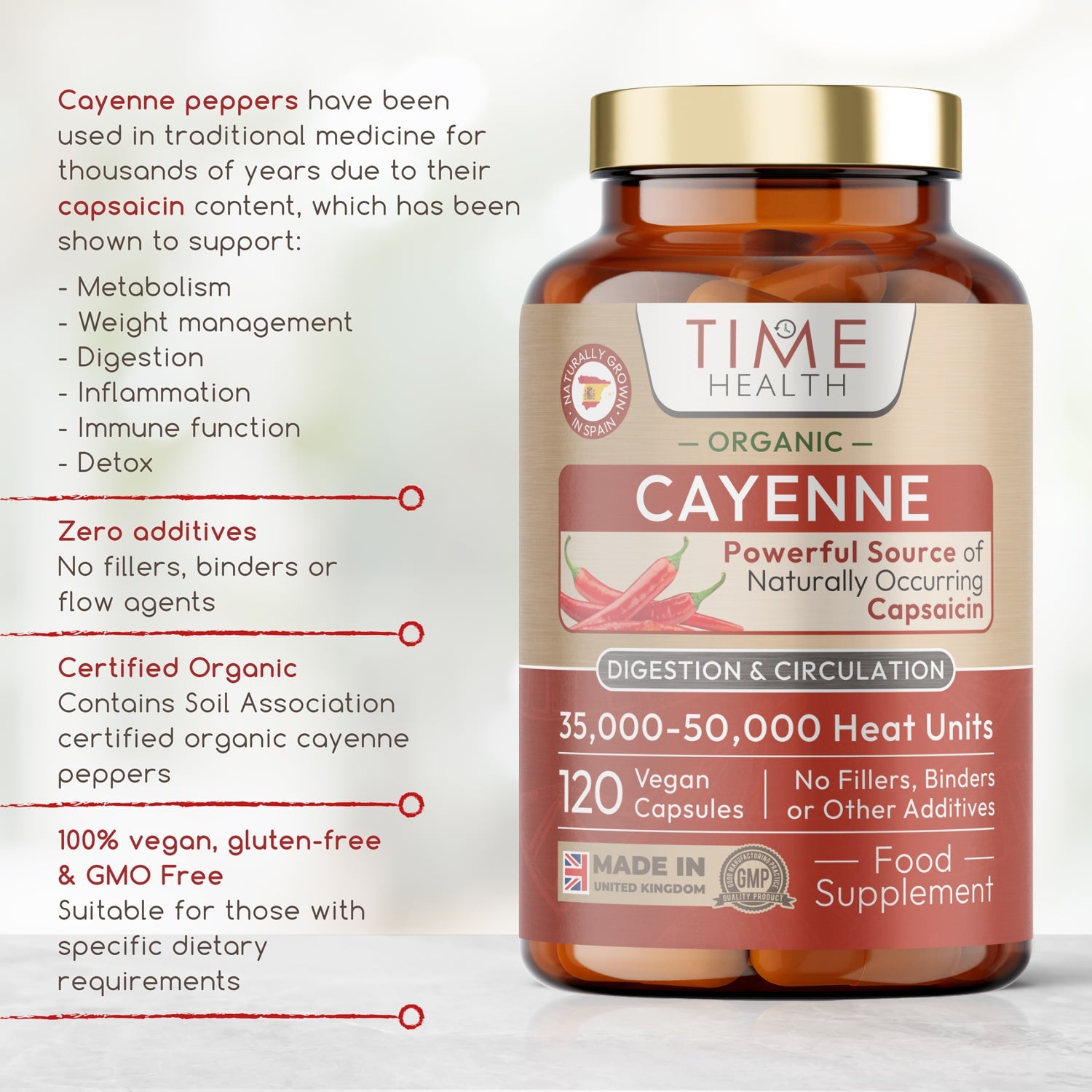✔️HIGH STRENGTH, SOIL ASSOCIATION CERTIFIED ORGANICALLY GROWN CAYENNE. Our Organic Cayenne capsules contain an exceptional grade of cayenne pepper powder, rated at 35,000-50,000 heat units (HU) for maximum benefits. We use premium Spanish grown cayenne peppers, certified by the Soil Association for guaranteed quality.