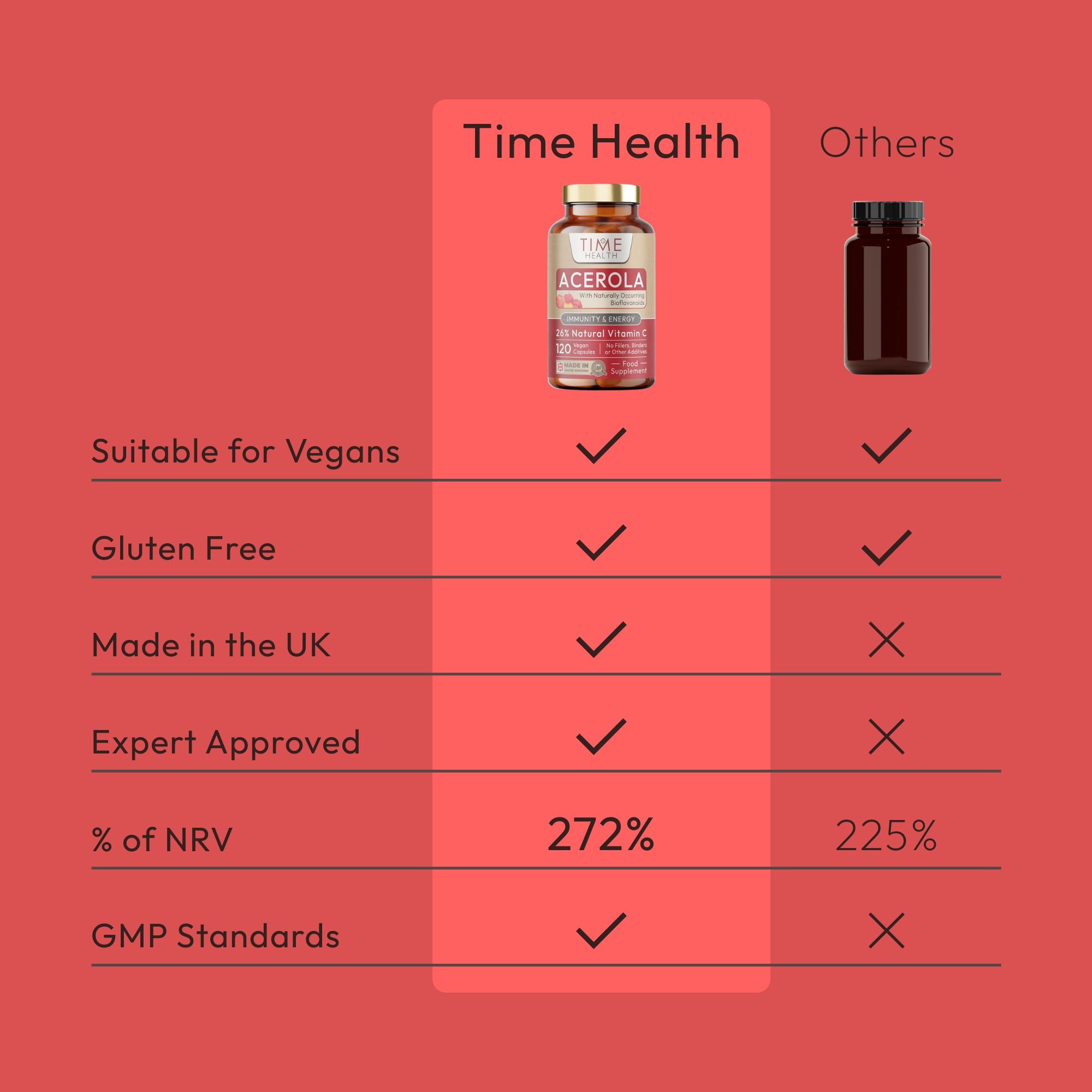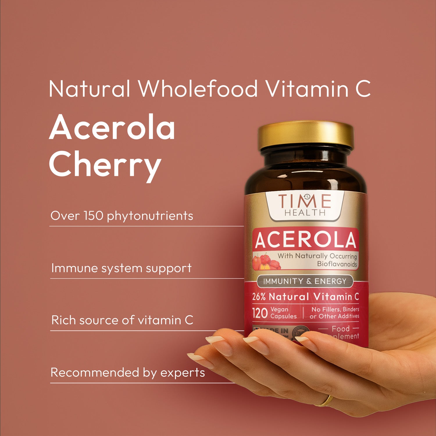 ✔️NEW & IMPROVED. Now contains 36% more Vitamin C than our previous version in the same size capsule. Time Health Acerola Cherry 100% Natural Wholefood Vitamin C capsules with naturally occurring bioflavonoids.