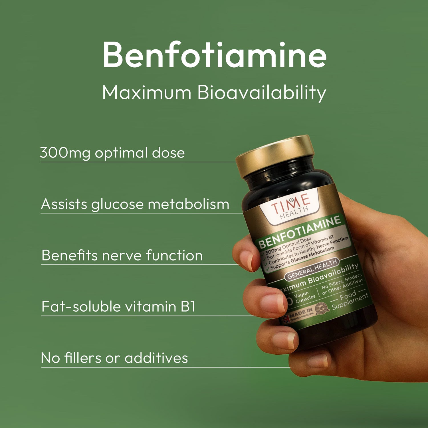 ✔️SUPPORTS KEY SYSTEMS. Benfotiamine is a fat-soluble form of vitamin B1, which has a better bioavailability than water-soluble forms. Benfotiamine can help increase Thiamine levels to support glucose metabolism, cognitive and nerve health, as well as overall health and other issues related to a low thiamine.