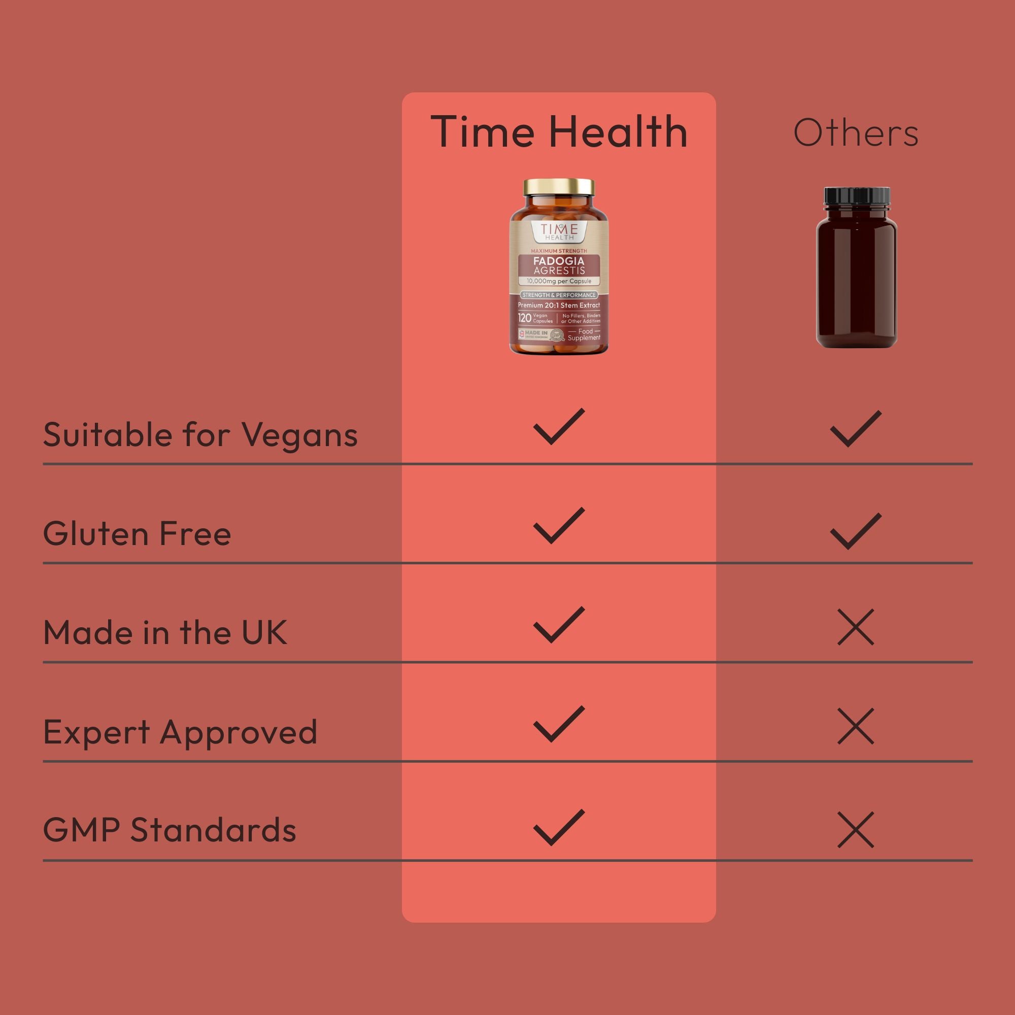 • Bottle of Time Health Fadogia Agrestis supplement held by a hand on a brown background | Hover