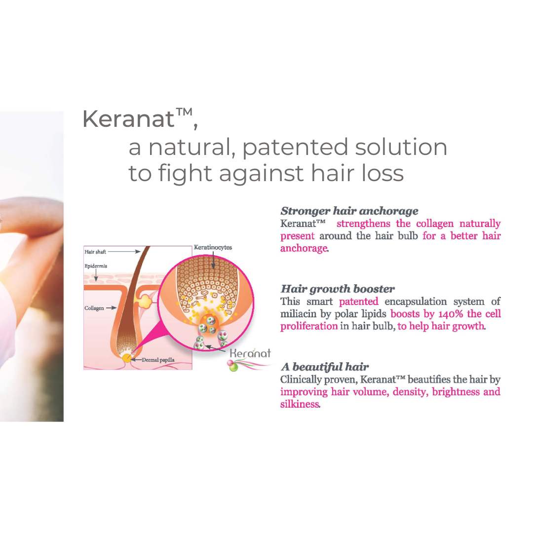 ✔️HAIR GROWTH BOOSTER. Keranat™ uses a patented encapsulation system of miliacin by polar lipids boosting cell proliferation in hair bulbs by 150%, helping with hair growth.