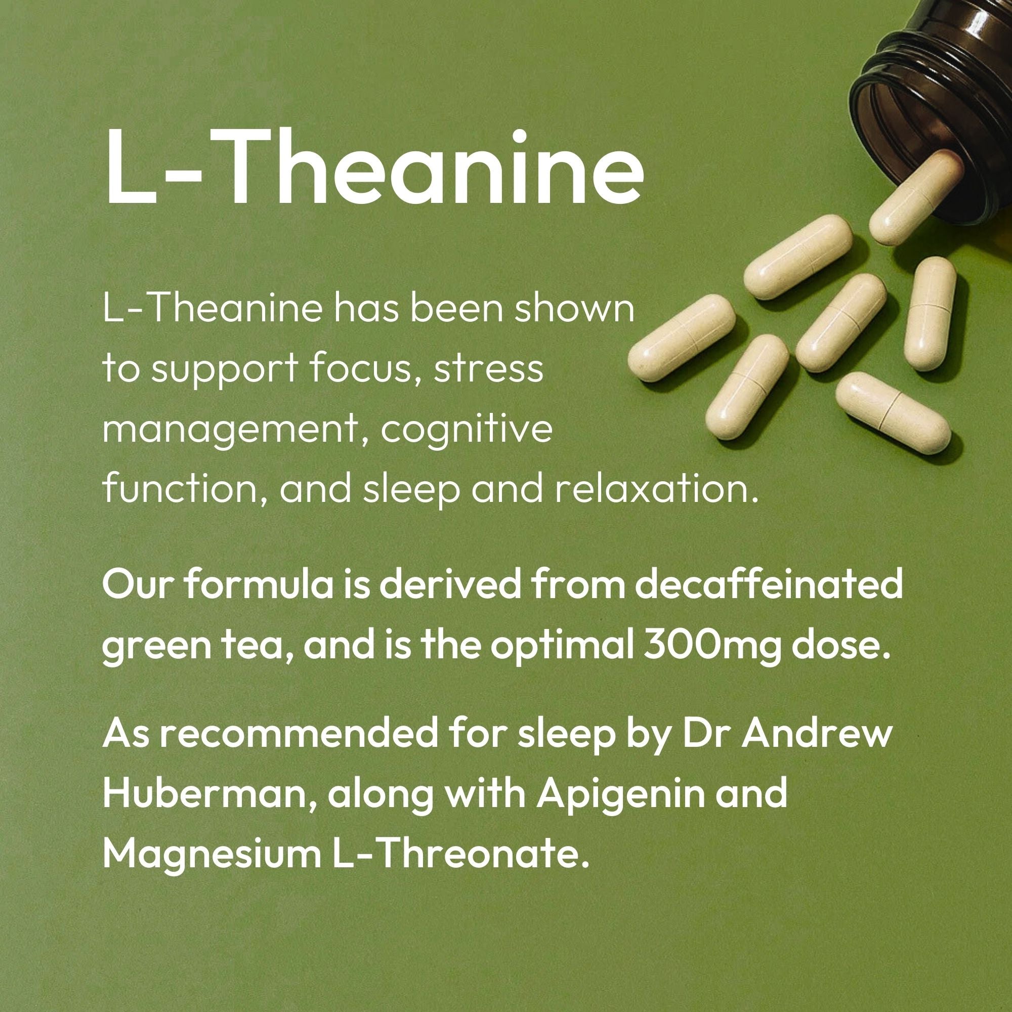 ✔️300MG PER 2 CAPSULE SERVING, RECOMMENDED BY EXPERTS. Leading neuroscientist Dr. Andrew Huberman recommends taking L-theanine as part of the ‘sleep cocktail’, a combination of powerful supplements (L-Theanine, Magnesium L-Threonate and Apigenin) that work synergistically to improve the quality and duration of sleep.