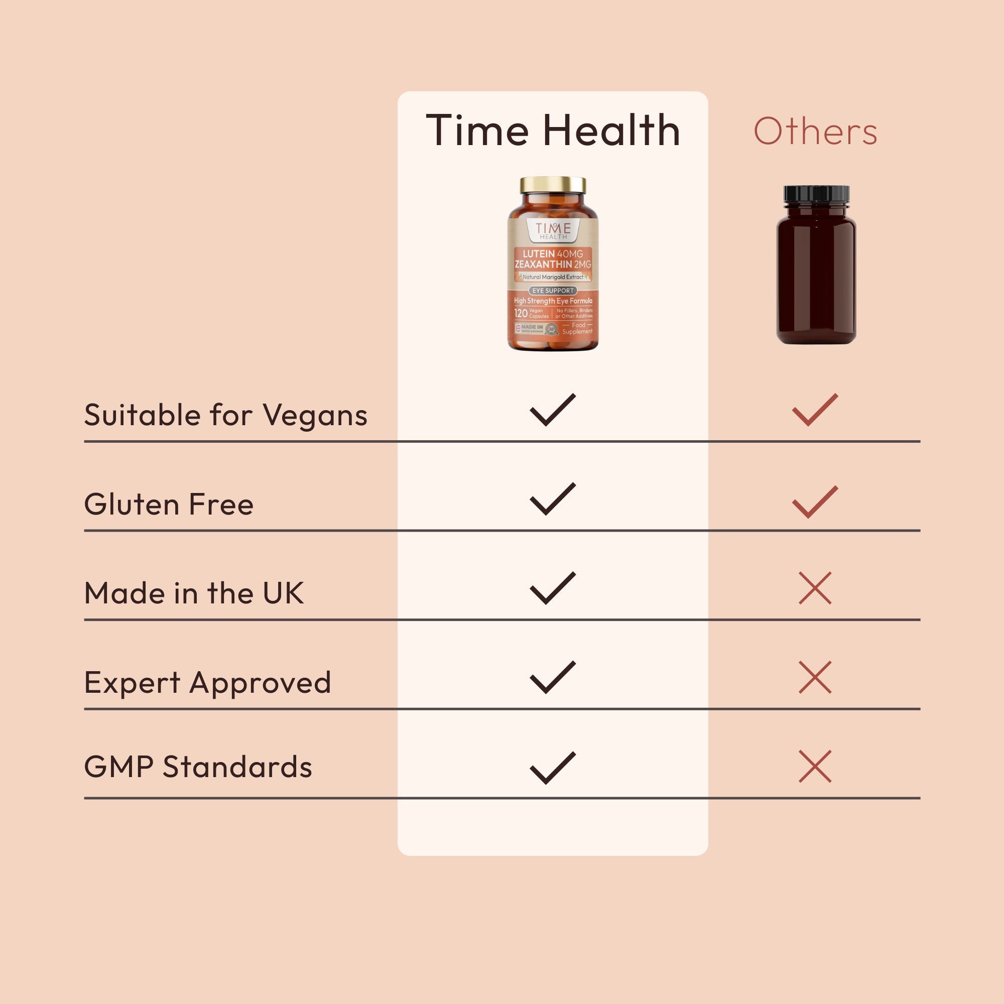 ✔️PREMIUM PRODUCT. Time Health 100% Natural 40mg Lutein with 2mg Zeaxanthin is extracted from marigold petals, a highly bioavailable natural source of these two important carotenoid nutrients. Micro-encapsulated in natural acacia tree gum for greater stability & bio-availability.