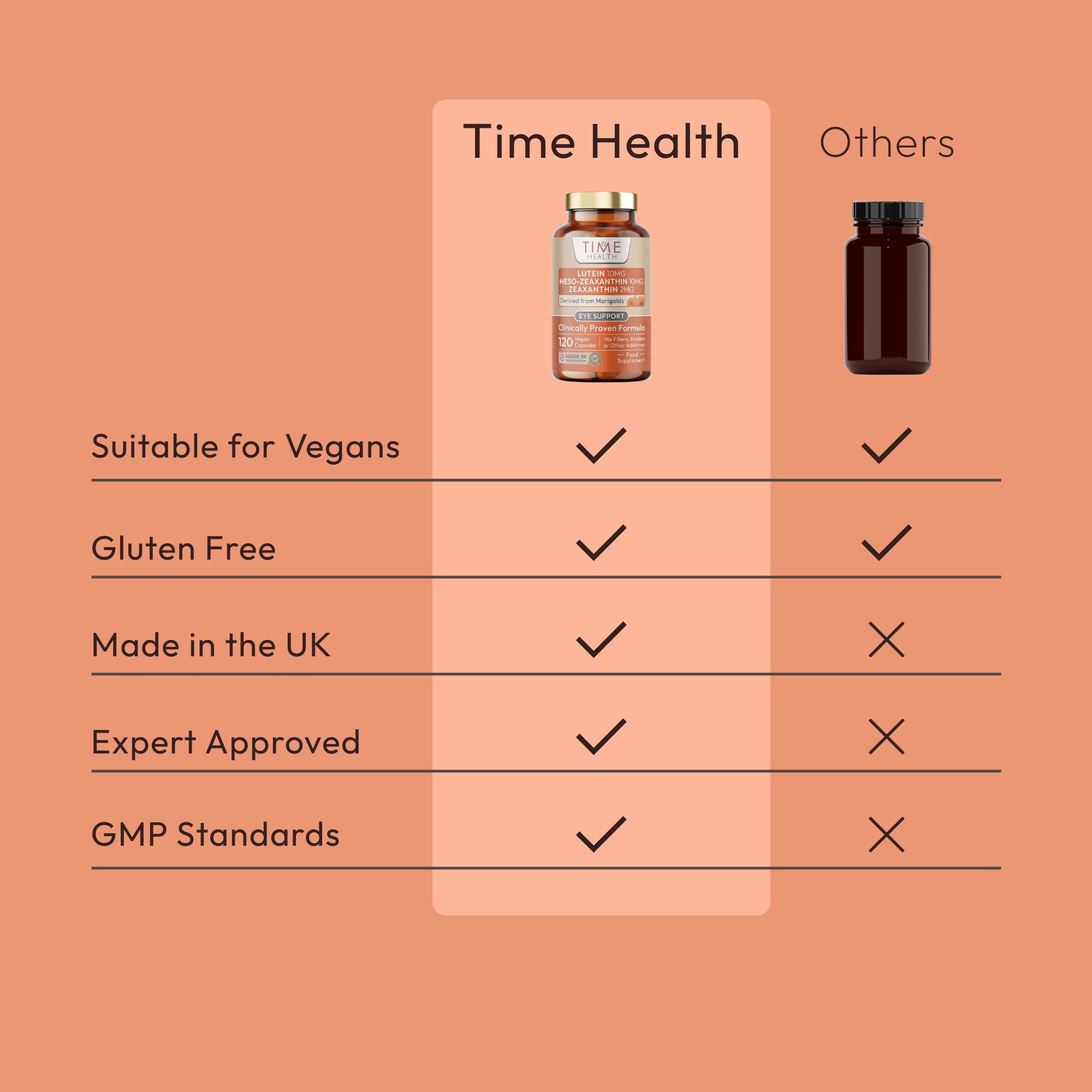 ✔️100% VEGAN WITH NO FILLERS, BINDERS OR ADDITIVES. Our Lutein 10-10-2 is 100% vegan friendly. At Time Health we believe in clean nutrition which is why you won’t find any nasty stuff in our products including any fillers, binders or additives, unlike some of our competitors.