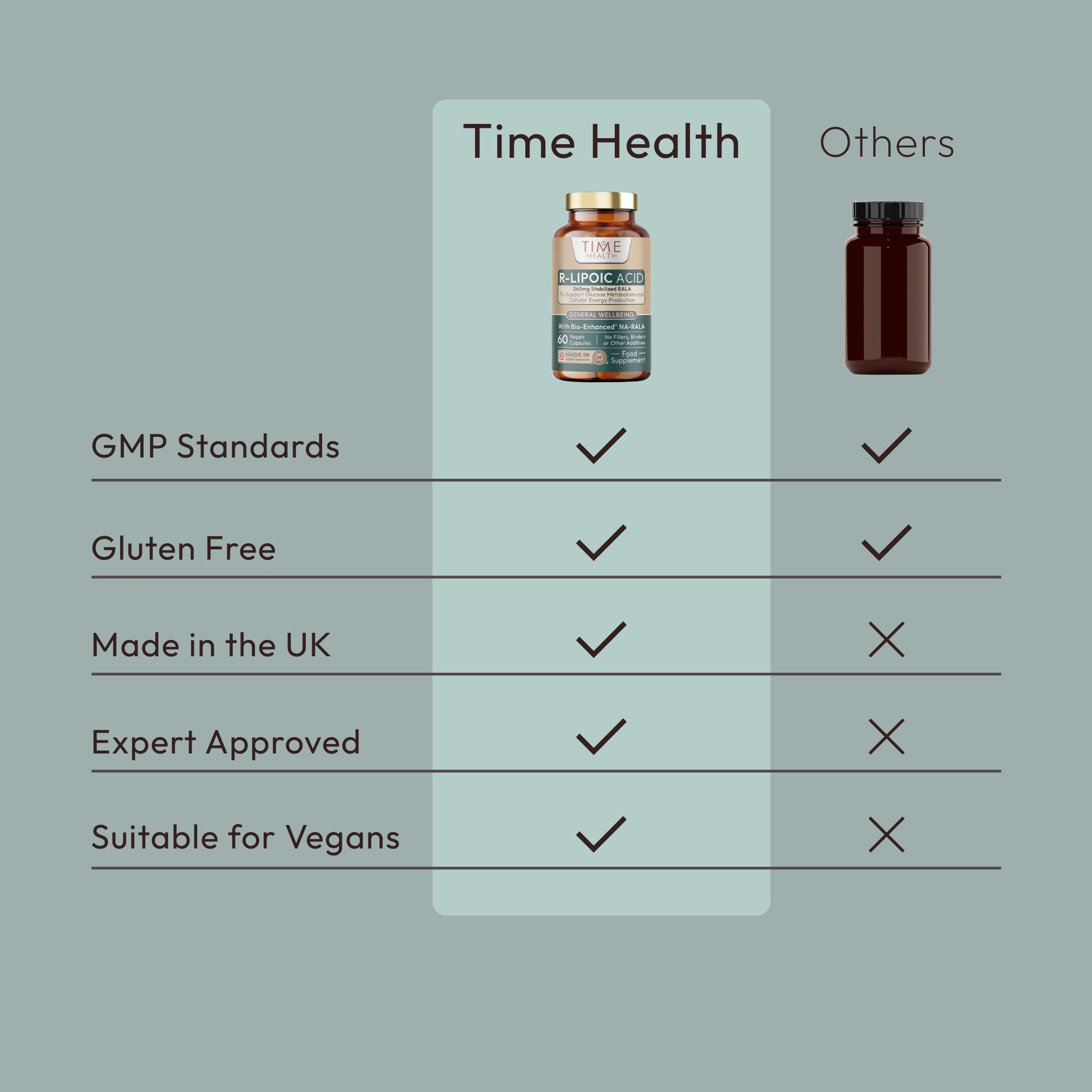 ✔️ SUPERIOR BIOAVAILABILITY & ANTIOXIDANT POWER. Our unique formula offers up to 40 times the bioavailability of standard R-ALA supplements. This allows for rapid absorption from plasma into tissues, ensuring maximum antioxidant support where it's most needed. R-ALA supports cellular defences, reduces oxidative damage, and helps regenerate other key antioxidants such as vitamins C and E, and glutathione.